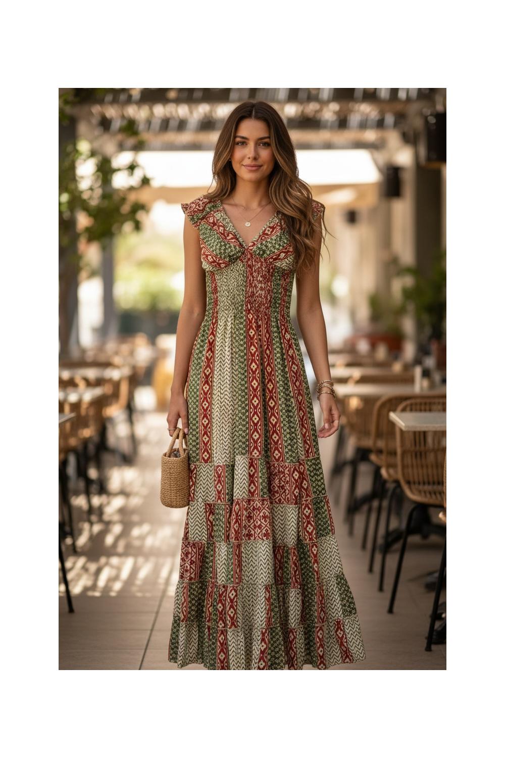 Féminin, léger et plein de charme, cette robe se distingue par son imprimé délicat et sa chute naturelle qui flatte la silhouette. L'encolure croisée en V met en valeur la poitrine avec élégance, tandis que la taille élastique s'adapte doucement au corps, offrant confort et définition.