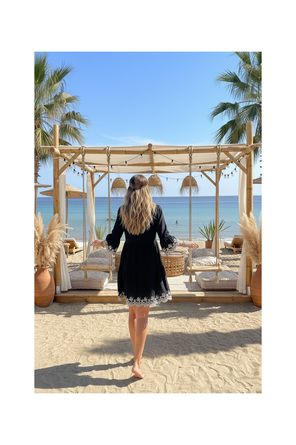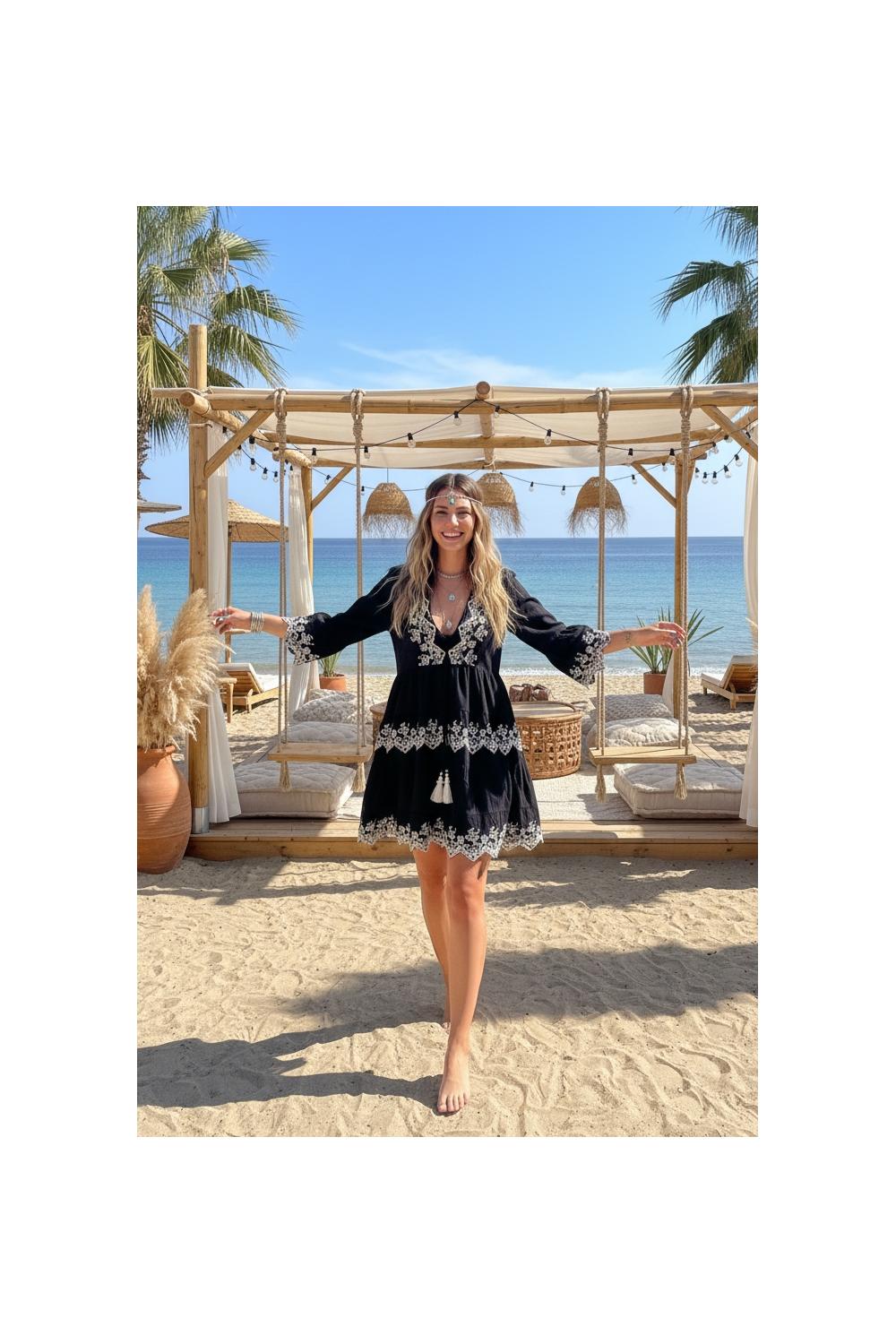 Robe courte de style bohème avec des broderies contrastées qui ajoutent une touche spéciale et élégante. Sa coupe fluide et ses manches larges le rendent confortable, léger et parfait pour les journées d'été.