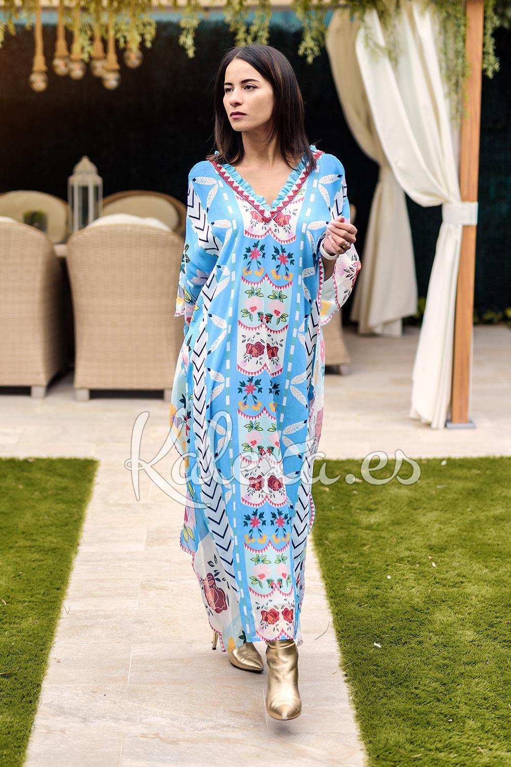 Lasciati avvolgere dall'essenza boho con questo spettacolare caftano. Progettato con una caduta fluida e rilassata, presenta aperture laterali che conferiscono movimento e un tocco elegante insieme a un comfort. Lo scollo a V valorizza la figura, mentre i delicati ricami con perline lo rendono un pezzo unico. Realizzato in India con amore e al 100% in viscosa.