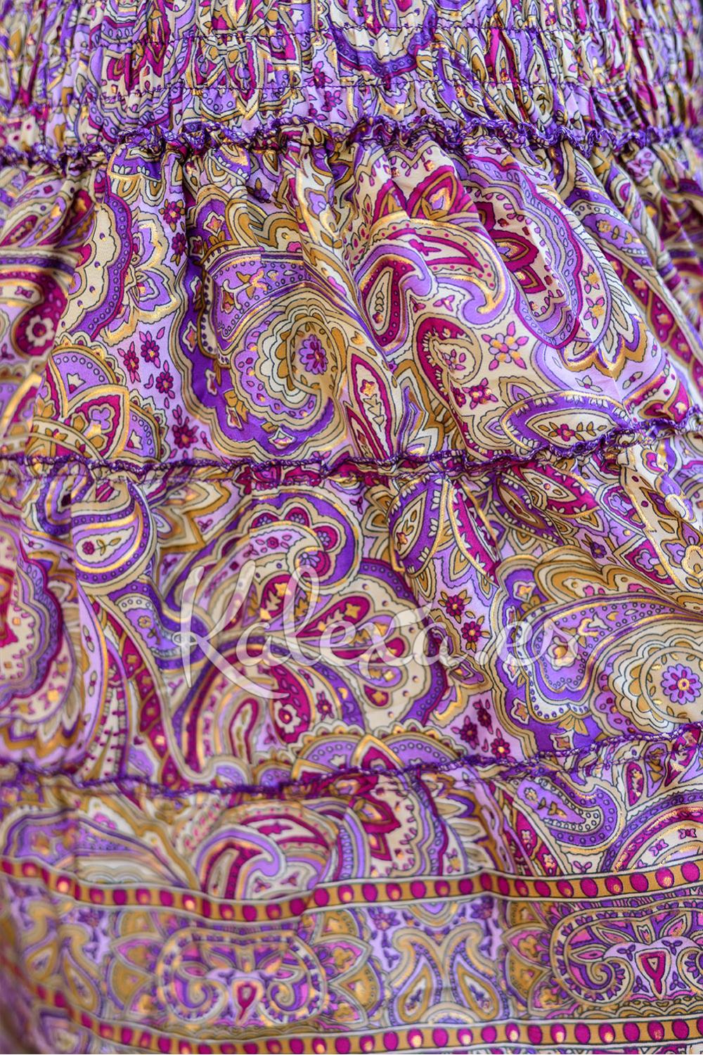 Abito boho senza spalline con corpetto a nido d'ape. Il taglio asimmetrico e il volo di oltre 4 metri creano un movimento etereo e avvolgente ad ogni passo. La caduta è fluida e spettacolare, ideale per chi cerca un look libero, romantico e pieno di personalità. Un capo semplicemente sbalorditivo. Realizzato in India con amore e 70% seta fredda, 30% viscosa.