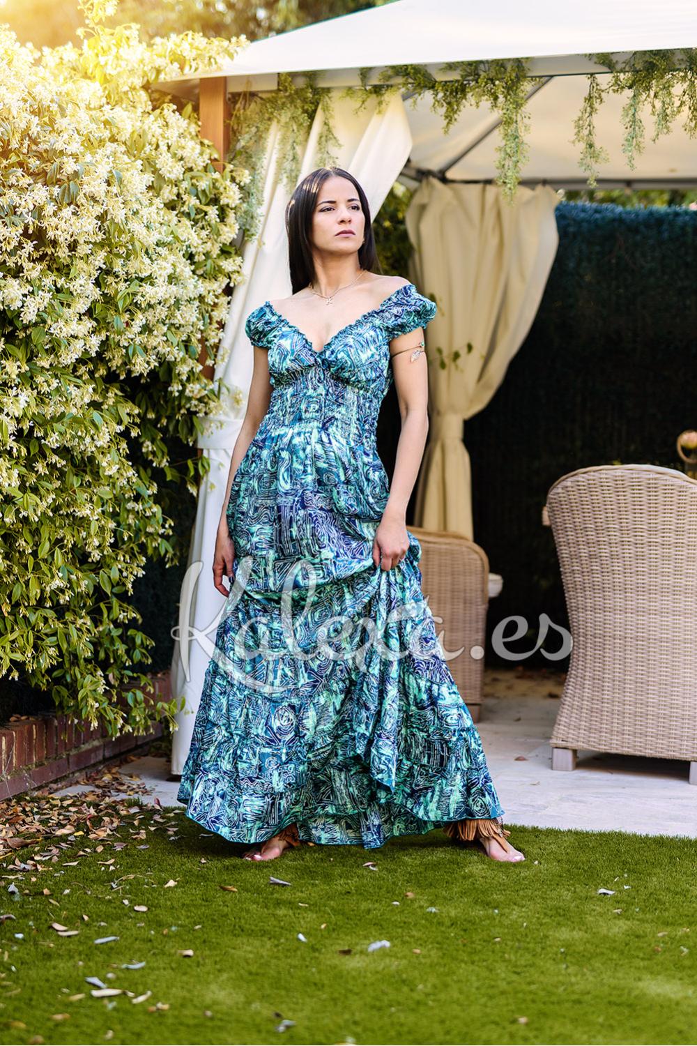 Questo abito boho chic, realizzato in un morbido tessuto composto al 70% da seta e al 30% da viscosa, si distingue per la sua stampa con delicati tocchi dorati che catturano la luce con eleganza. La sua vita elastica a nido d'ape si adatta comodamente, esaltando la figura senza sforzo. Lo scollo a V incrociato, regolabile, offre versatilità e un'aria femminile molto favorevole.