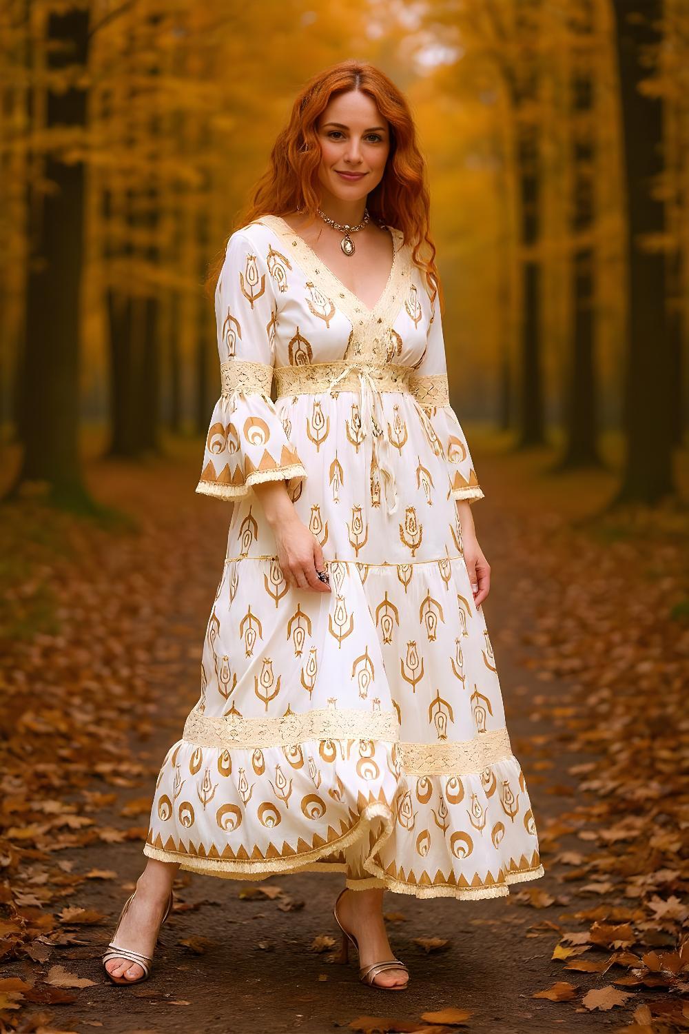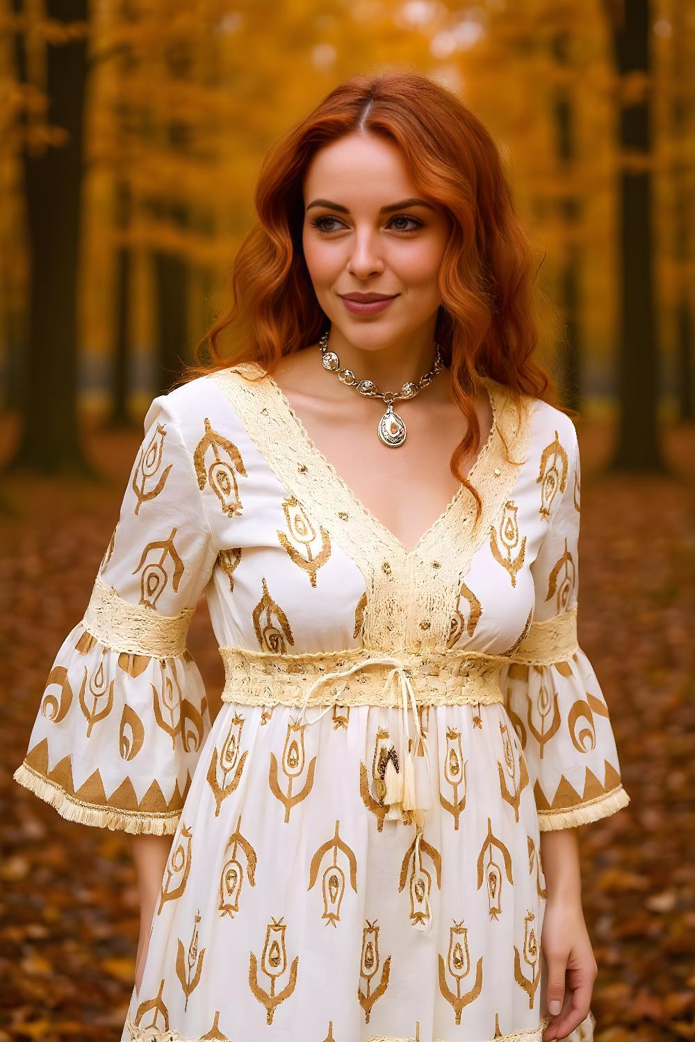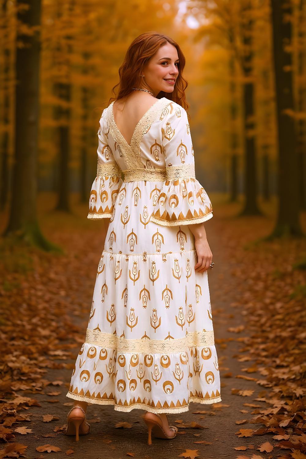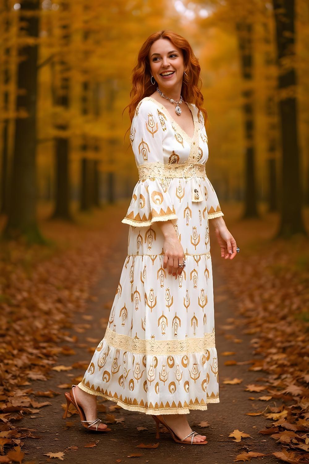 Questo abito è un gioiello d'ispirazione bohémienne e spirito mediterraneo. Il suo scollo a V e la cintura elastica sono decorati con un delicato pizzo all'uncinetto coordinato, mentre la stampa bianca con dettagli dorati è arricchita da minuscole perline e specchietti che catturano la luce con eleganza.