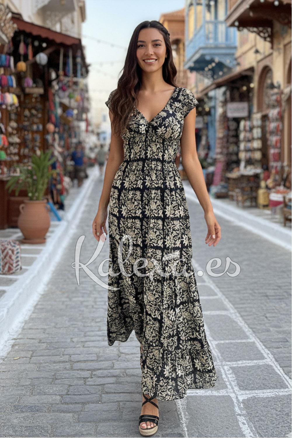 Elegante, femminile e versatile, questo vestito si distingue per la sua stampa sofisticata e la sua silhouette favorevole. Con vita elastica, scollo incrociato a V e maniche corte con finitura elastica, unisce stile, comfort e un fascino bohémien senza tempo.