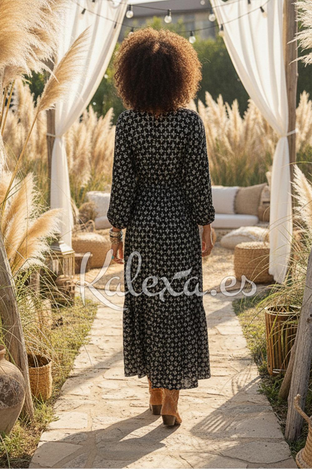 Il contrasto del suo stampato nero con disegni bianchi lo rende un capo senza tempo e versatile, ideale per chi cerca uno stile boho chic autentico, libero e sofisticato.