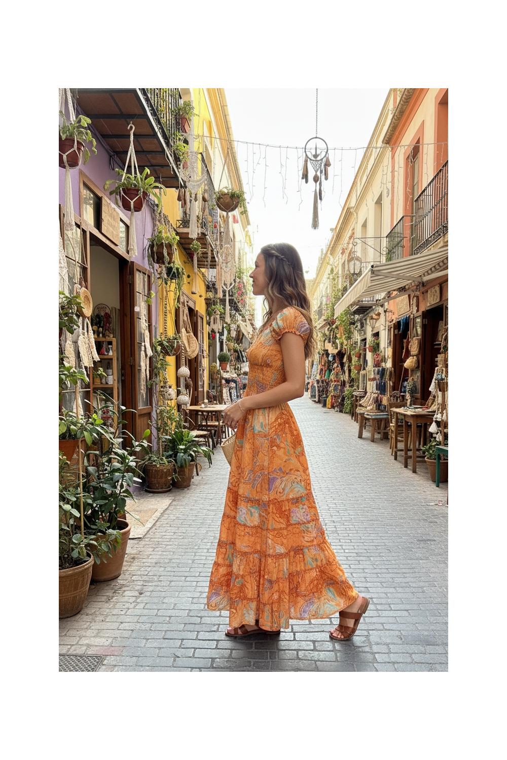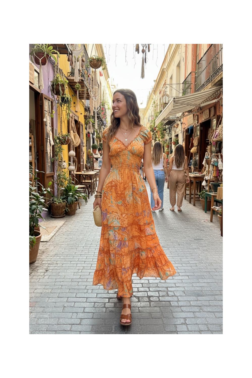 Abito boho chic, elegante, femminile e molto versatile. La stampa sofisticata e la silhouette fluida lo rendono un capo speciale per ogni occasione. Lo scollo a V slancia e la vita elastica si adatta comodamente, valorizzando la figura.
