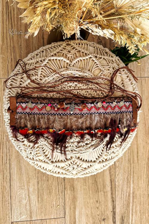 Cintura boho con piume e dettagli ricamati con pompon e teschio di toro pendente, con spalline da legare dietro. Un capo ideale per rendere bohémien qualsiasi tuo indumento. Un mare di sensazioni. La parte anteriore misura circa 40 cm.