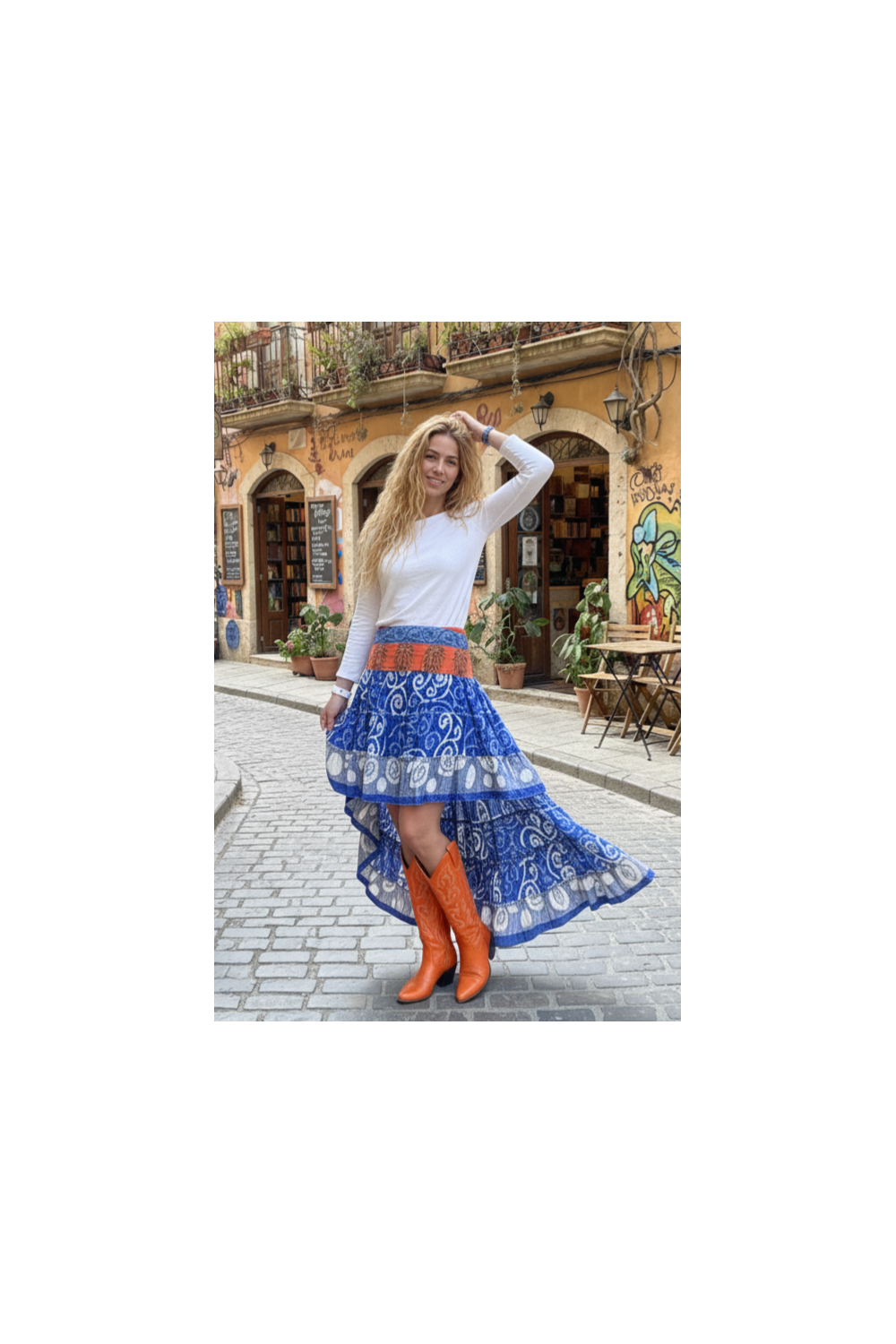 Gonna asimmetrica in seta stile boho, leggera con un fluido cadere spettacolare. Ogni stampa è unica e c'è solo un pezzo per design, rendendola un capo esclusivo e speciale.