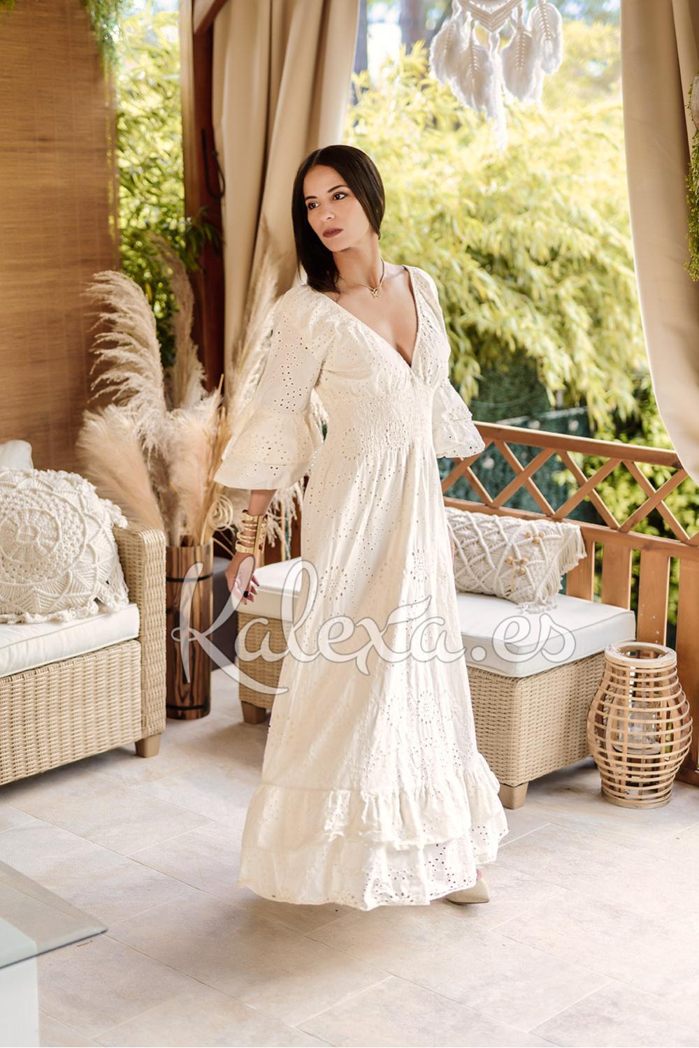Abito boho chic in pizzo inglese con scollo a V regolabile, vita elastica a nido d'ape. Le maniche hanno volant coordinati con il fondo. L'abito ha un sottoveste integrato. La caduta è bellissima, semplicemente uno spettacolo di abito. Romantico e divino. Realizzato in Italia con amore e al 100% in cotone.