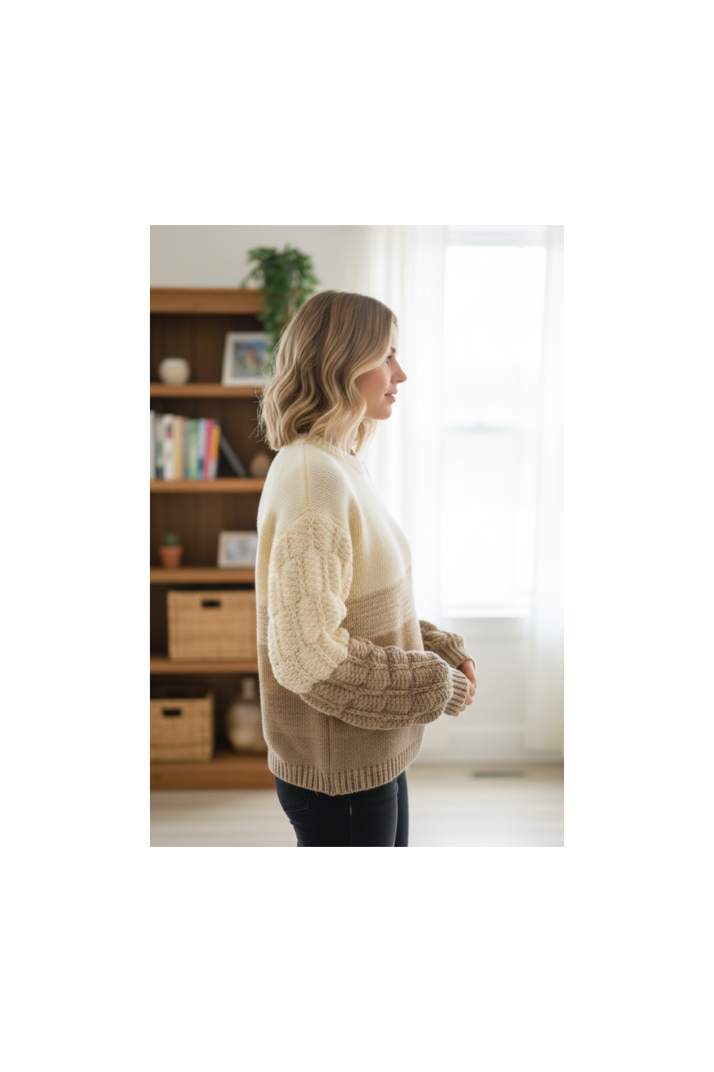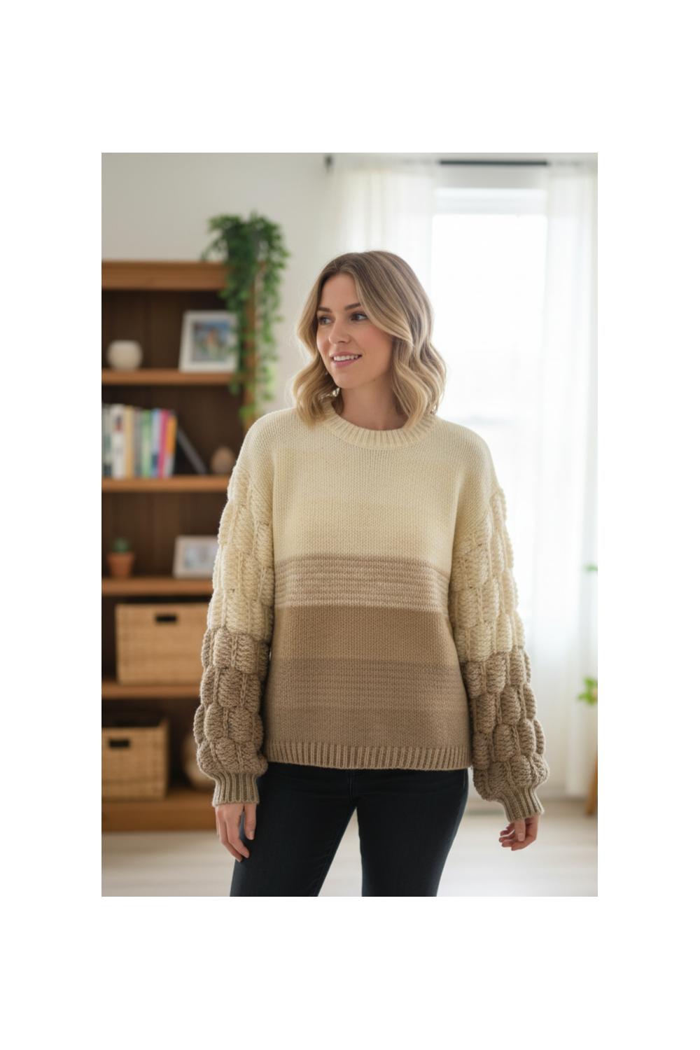 Maglia morbida a righe nei toni neutri, con maniche a sbuffo che aggiungono texture e stile. Comoda, calda e versatile, ideale per un look casual con un tocco elegante nella vita di tutti i giorni. 100% poliestere.