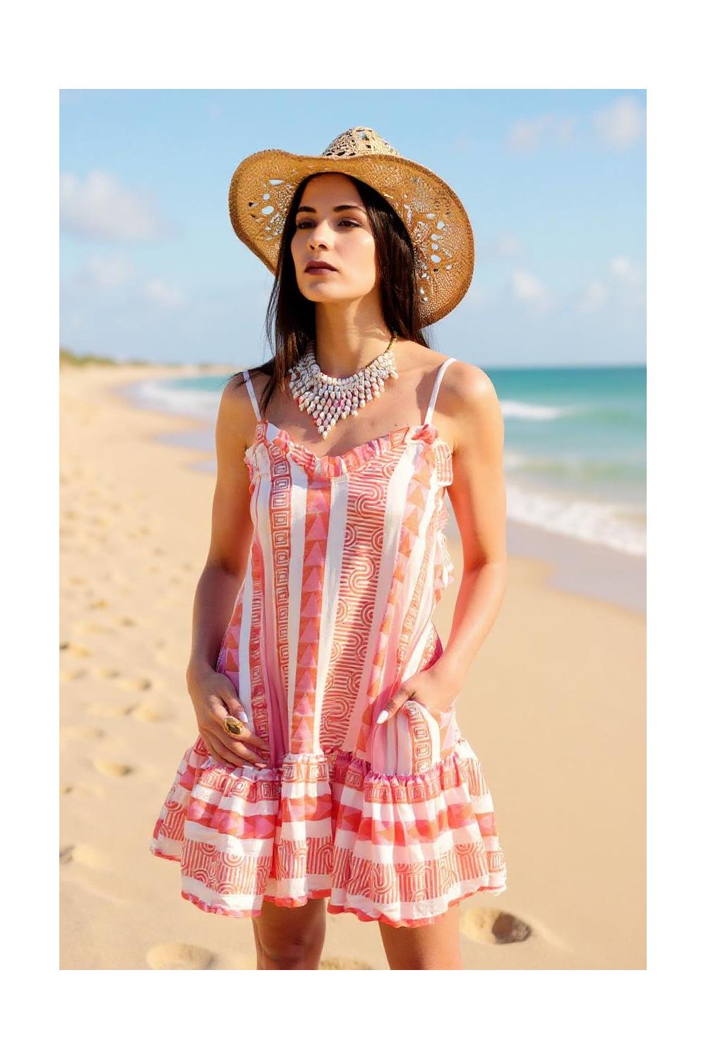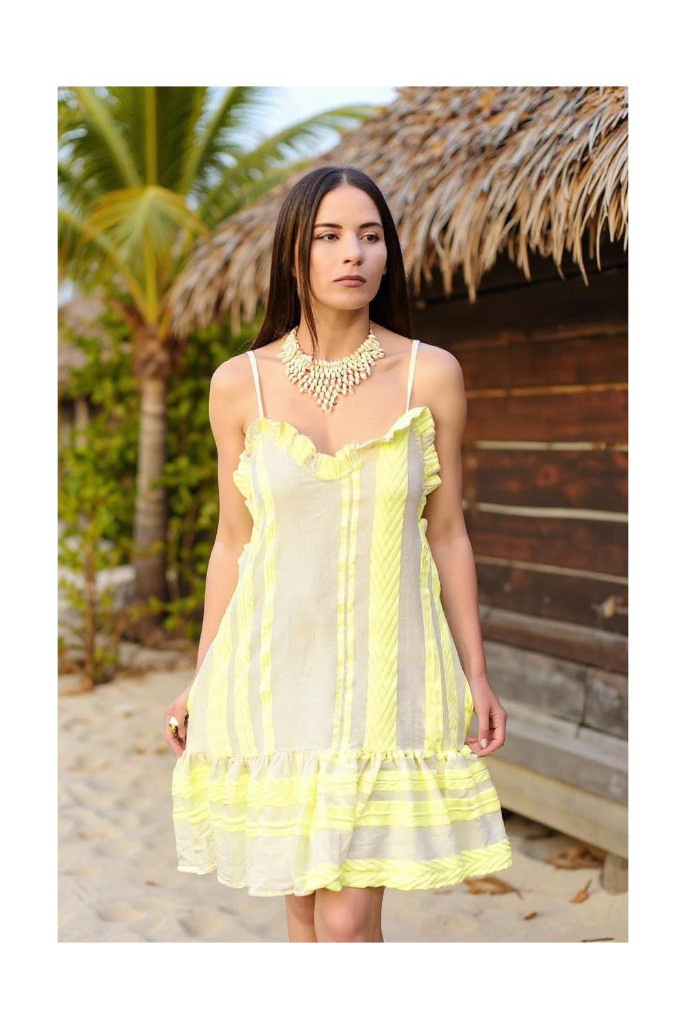 Abito corto boho chic in fluoro, avanguardia, moderno, confortevole, fresco e molto originale; questo è il vestito con ricamo in fluoro e cotone. Ha una scollatura a forma di cuore con cinghie, e indossa cinghie sul retro per regolare e adattarsi. La caduta spettacolare, e il vestito è un overflow di lbertad, avventura e gioia. Prenditi cura dei diversi! Made in Italy con amore e 100% cotone.