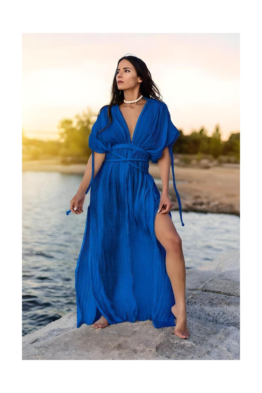 Boho chic Griekse kleding met rimpels op de knie, schouders en rug.Hij draagt de nek in V en de gesneden schuim zijn multipositie.Een originele, sensuele en verastele model, waarmee je je meest creatieve, gedreven en bohemische kant kunt halen.Gemaakt in India met liefde yv 100% katoen.