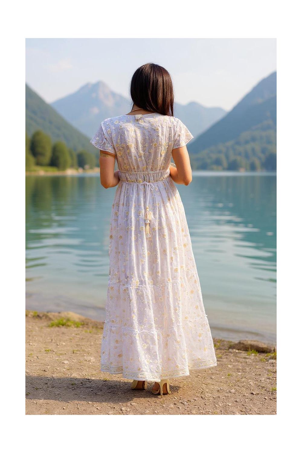 Verloofde bruid of gast draagt een georgette weefsel van lakens, geborduurd met kleuren van kleine gouden lintjes, de snijlijn is in V gekruist en de taille is elastisch. Hij heeft banden aan zijn riem die je kunt stroppen of in verschillende posities kunt plaatsen. De val is los, elegant en romantisch, draagt een binnenkant. Een begunstigend en mooi model. Made in India met liefde en 100% viscose.