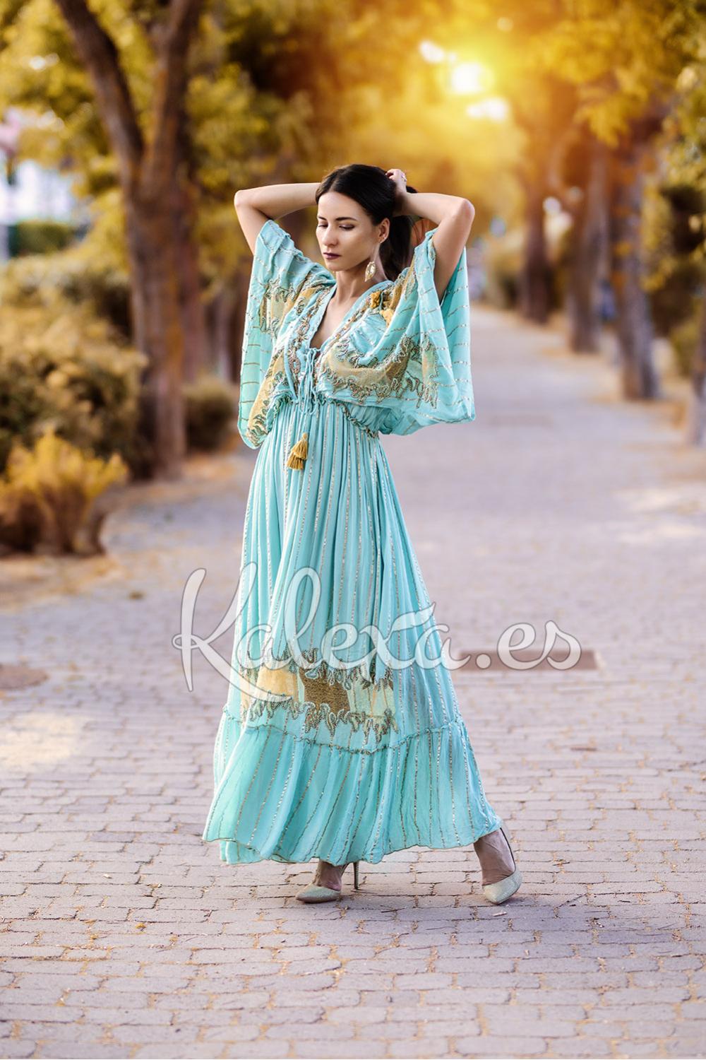 Deze boho-jurk met een verfijnde uitstraling valt op door de delicate borduursels van kralen en subtiele gouden accenten die het patroon verlichten met een vleugje elegantie.