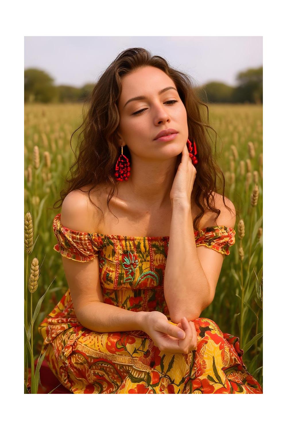 Gemaakt in India met liefde, deze jurk is een wervelwind van vreugde en stijl. De honingraatborst past zich zachtjes aan, terwijl de delicate handgeborduurde kraalapplicaties een ambachtelijke en stralende touch toevoegen. De elastische mouwen versterken het comfort, en de vloeiende val met binnenvoering omhult de silhouet met een romantische, vrouwelijke en energieke uitstraling.