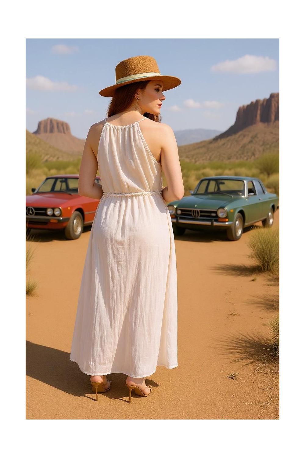 Jurk in boho-chique stijl van katoen, met verstelbare bandjes en een subtiel decolleté dat de vrouwelijkheid moeiteloos benadrukt.