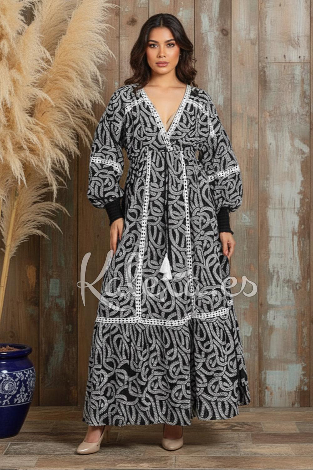 Elegant en met een ambachtelijke ziel, deze jurk heeft een volledig geborduurde stof die het uniek maakt. Met lange mouwen en elastische manchetten, een aanpasbare taille en een V-hals, accentueert het de silhouet met stijl en comfort.