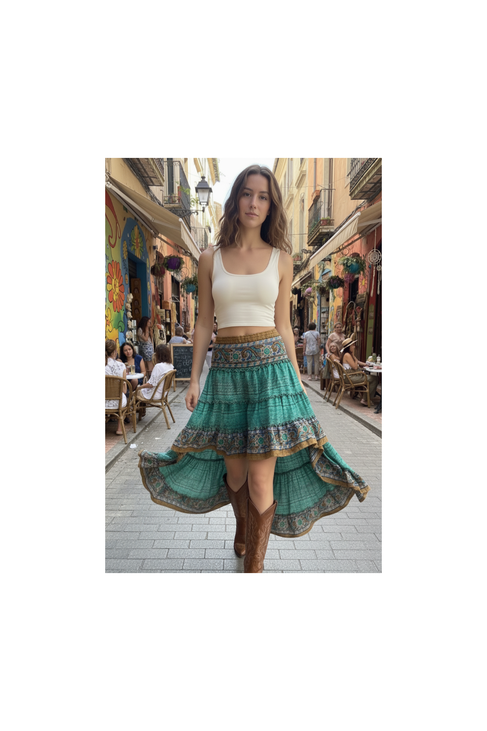 Een veelzijdige en vrouwelijke rok, ideaal om te combineren met basic tops, bohemien blouses of cowboylaarzen, perfect voor zowel dagelijkse outfits als speciale looks met een mediterraan en ambachtelijk tintje.