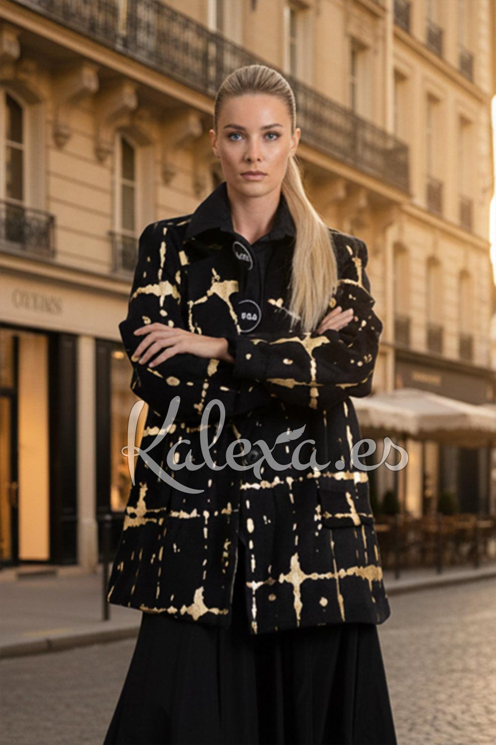 Een avant-gardistisch jasje met gouden gravures die licht, elegantie en een vleugje verfijning toevoegen. Het zorgvuldige ontwerp en de voering zorgen voor comfort en een onberispelijke pasvorm.