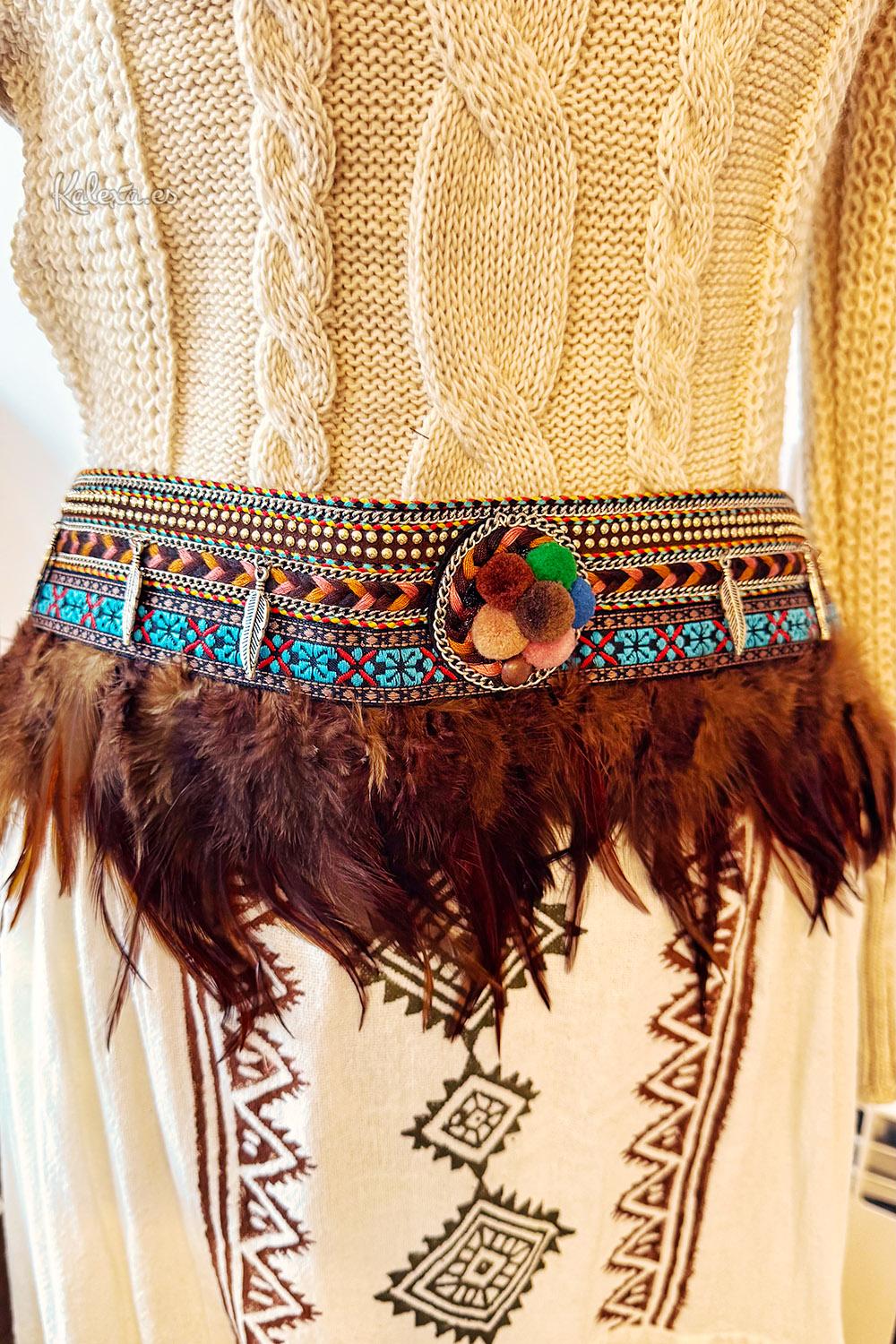 Bohemian riem met veren en pompon details, heeft hangende slagtanden en geborduurd lint. Ideaal om die bohemien touch aan je looks te geven.