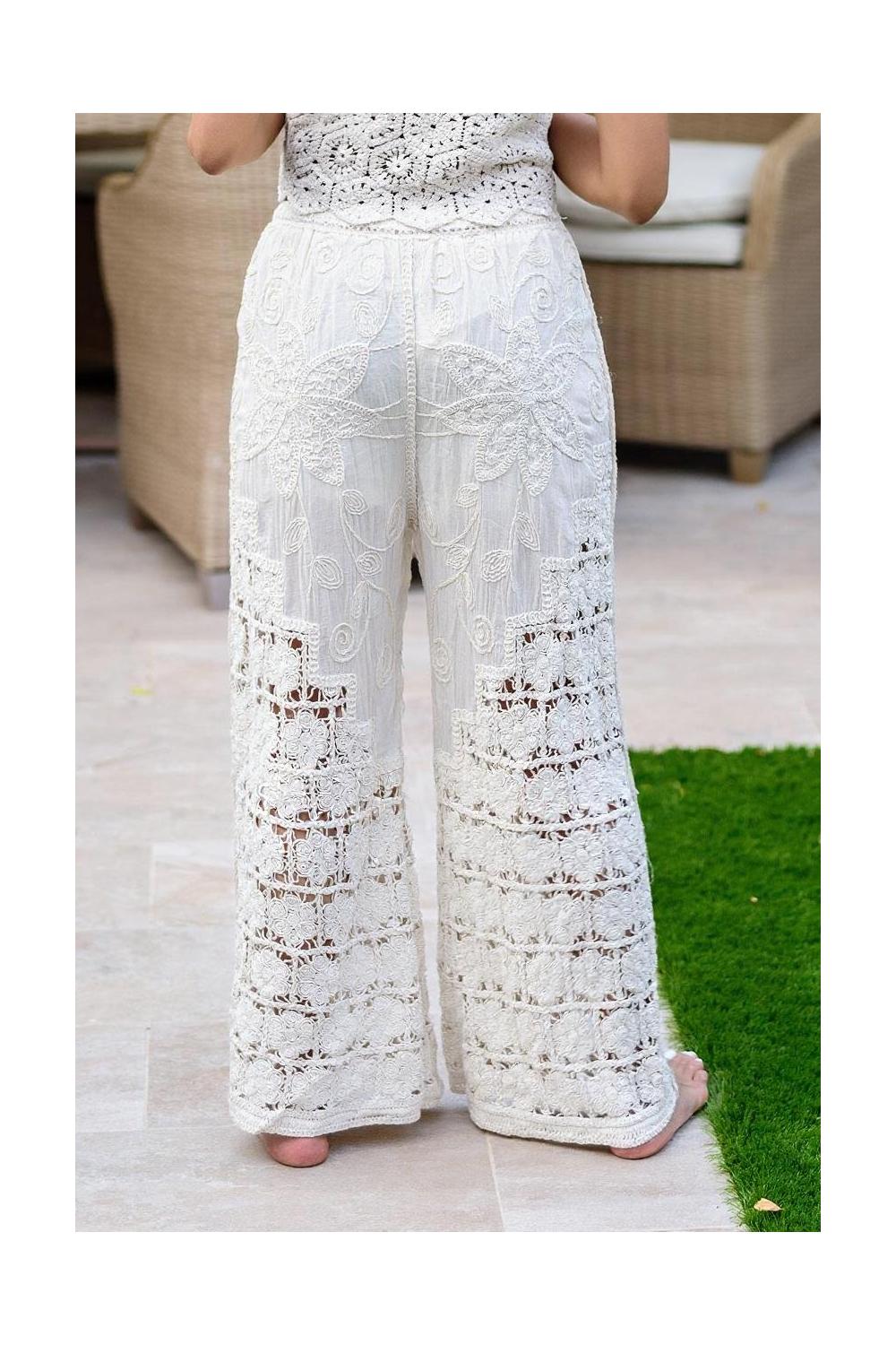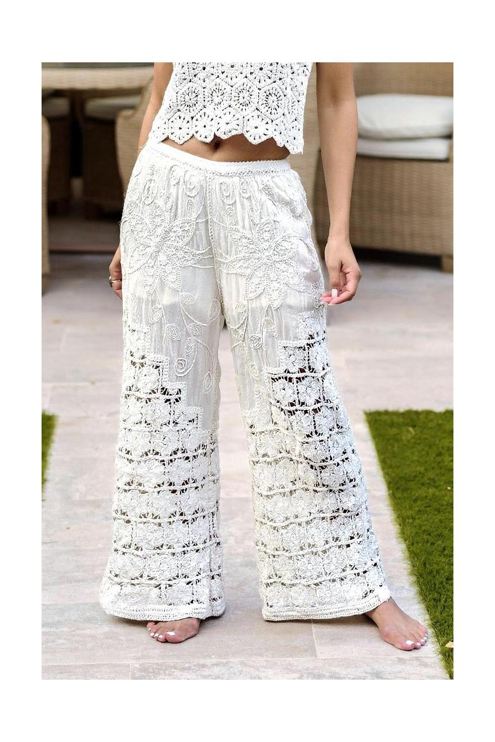 Boho calças chiques em crochê, usa um revestimento por baixo e a cintura é elástica. O tecido é espetáculo, sem dúvida uma roupa original e muito chique. Feito com amor e 95% algodão, 5% poliéster.