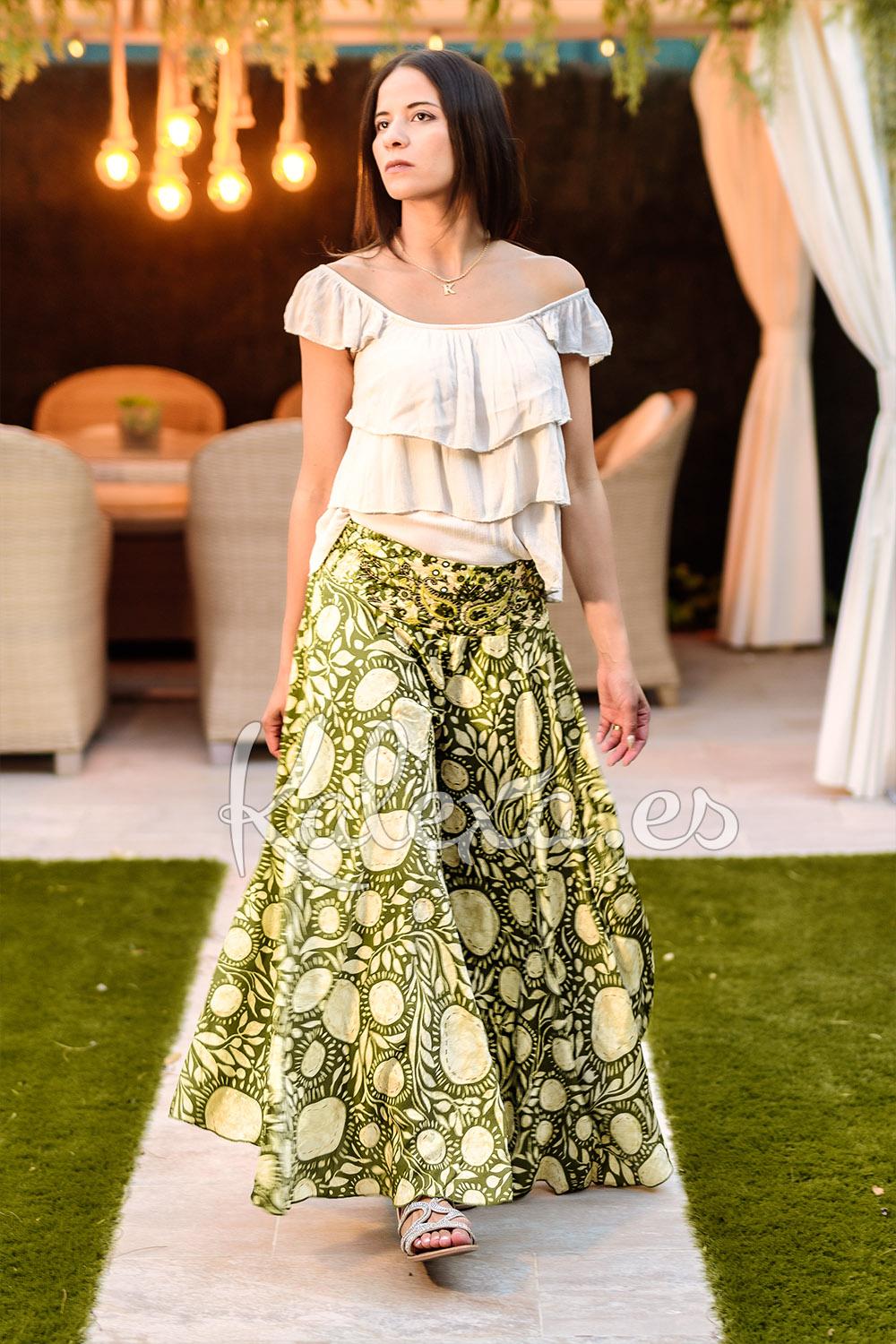 Uma peça única, original e versátil, com mais de 6 metros de voo entre as pernas que cria um efeito de saia ampla ao caminhar.