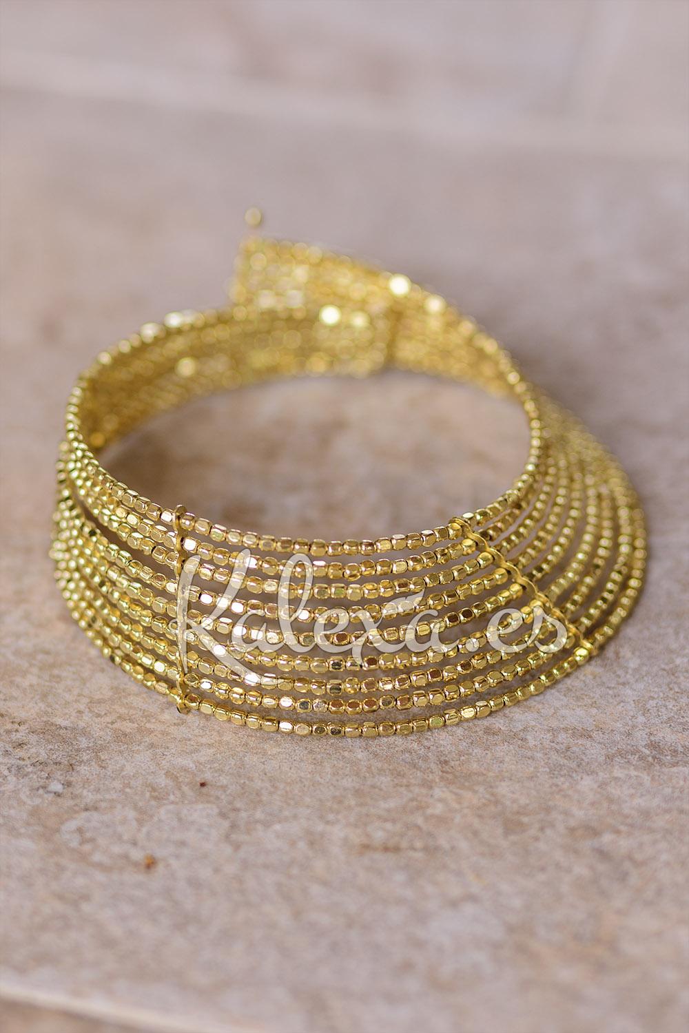 Este colar de inspiração boho é feito de contas metálicas delicadas e possui um design flexível que se ajusta confortavelmente ao pescoço.