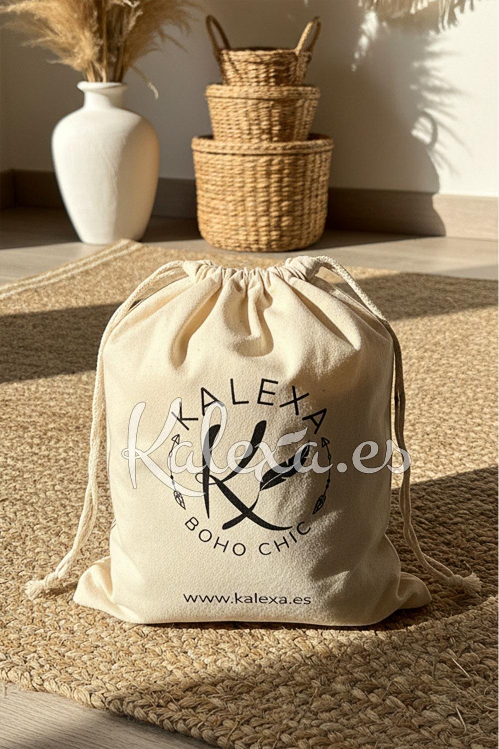 Sacola de algodão natural com o logotipo da Kalexa, ideal para guardar roupas, acessórios ou usar como embrulho de presente sustentável. Seu fechamento com cordões laterais permite um ajuste confortável e seguro, mantendo seu charme artesanal.