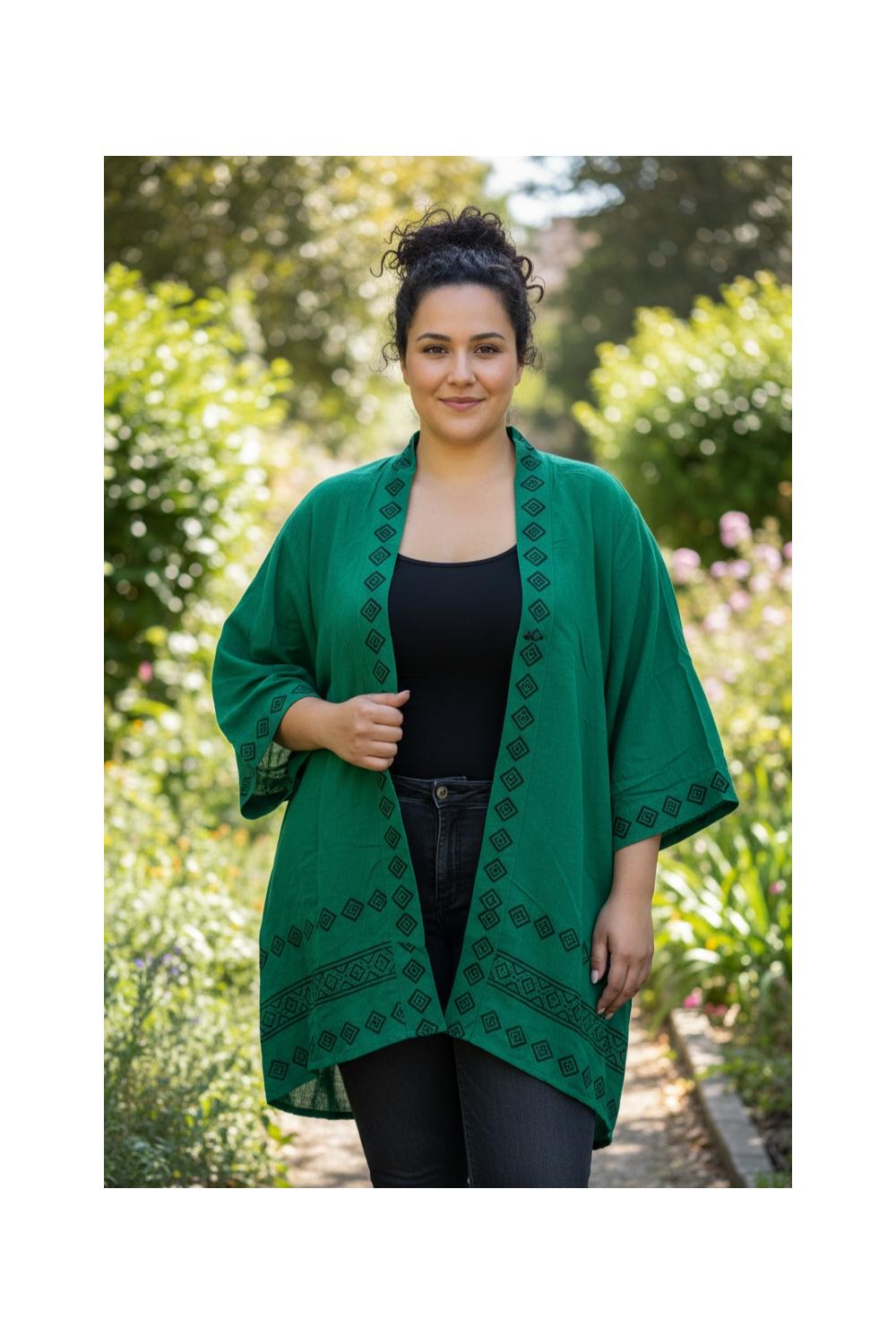 Quimono leve e muito versátil, perfeito para dar um toque boêmio e elegante a qualquer visual. Seu design aberto e mangas amplas proporcionam conforto e movimento, enquanto a estampa geométrica adiciona um toque artesanal muito especial. Ideal para combinar com vestidos, jeans ou looks mais descontraídos.