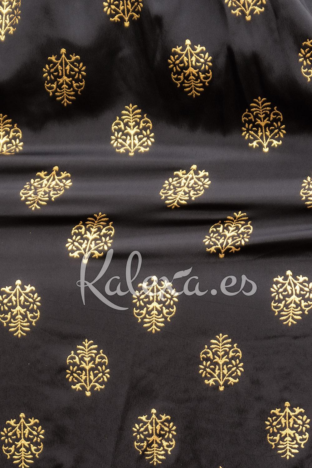 Vestido boêmio, com estampado em dourado e cintura elástica em favo de abelha. Possui decote cruzado em V, mangas ajustáveis. Uma beleza autêntica, elegante e favorecedora. Sem dúvida, este modelo se tornará um dos seus favoritos para as noites de verão! Feito na Índia com amor e 70% seda, 30% viscose.