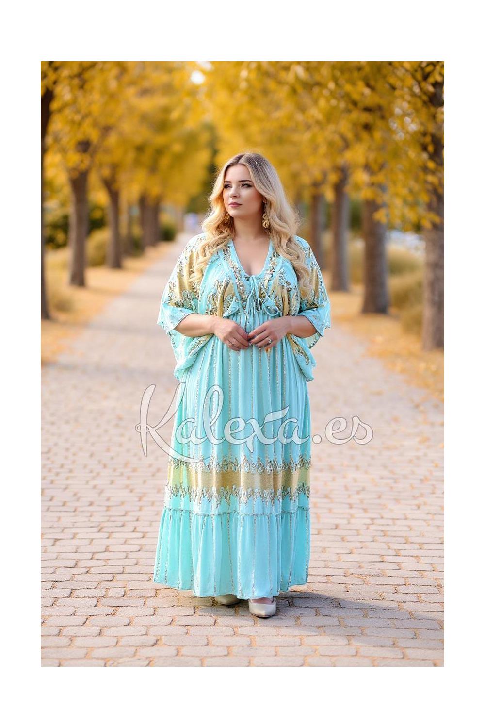 Este vestido boho com ar sofisticado destaca-se pelos seus delicados bordados em pedraria e pelos sutis brilhos dourados que iluminam o estampado com um toque de elegância.