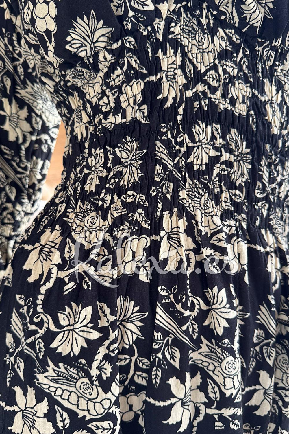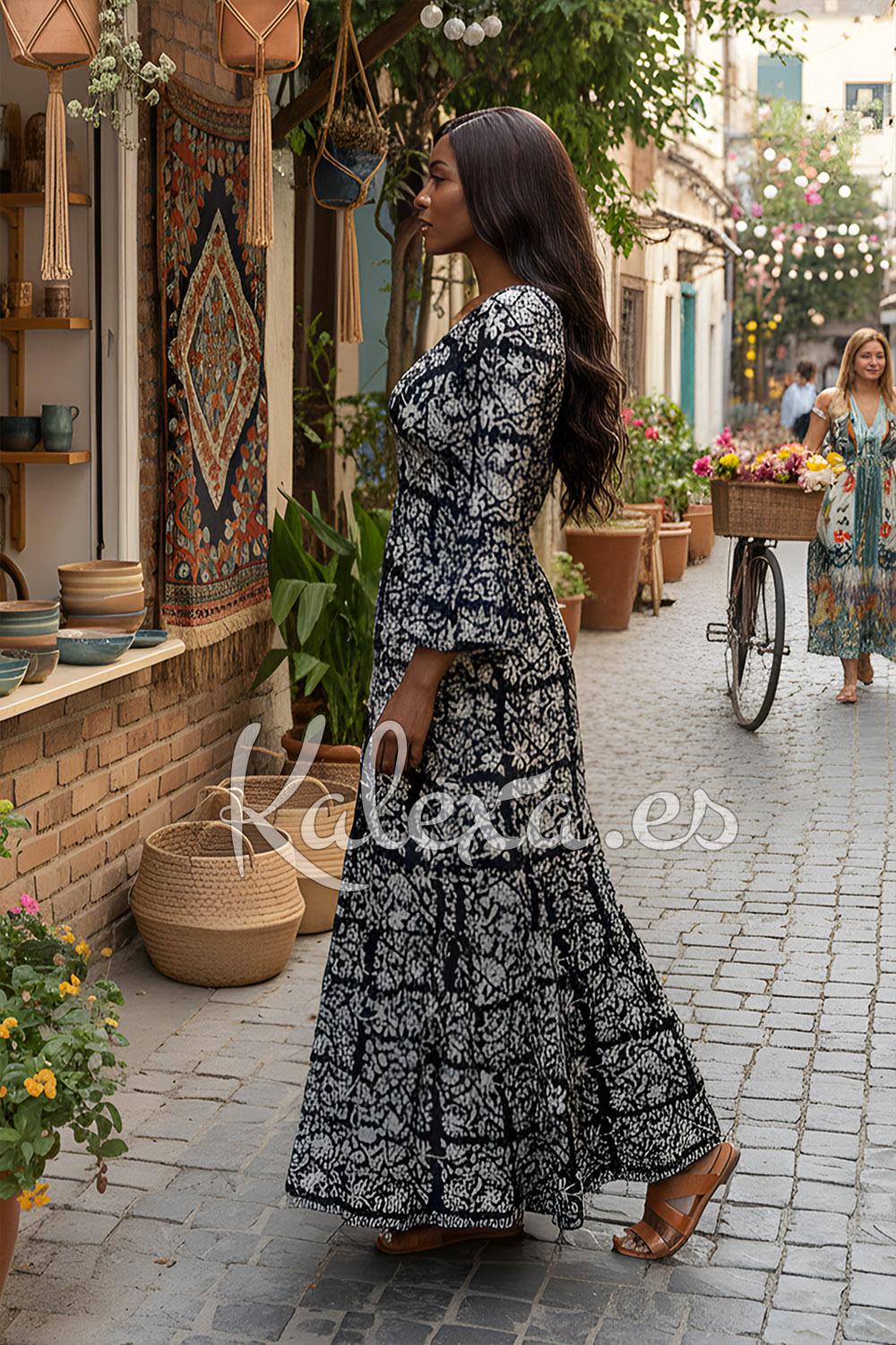 Elegante e atemporal, este vestido apresenta um estampado com um ar sofisticado e versátil. Sua cintura elástica, decote cruzado em V e mangas ajustáveis o tornam um item essencial chique e favorável.