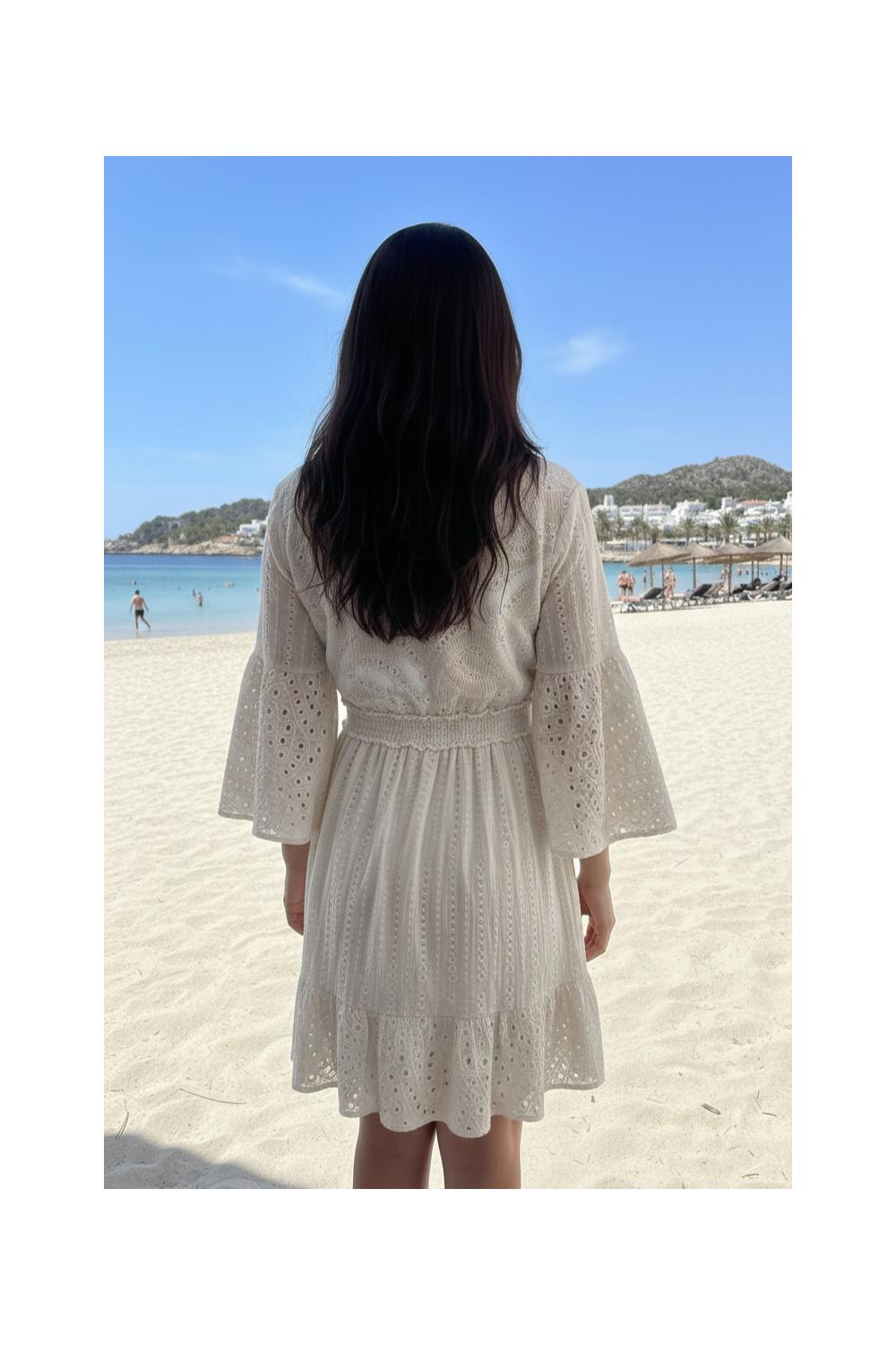 Vestido de algodão bordado em tom cru, com decote em V e laço ajustável que realça a silhueta. Mangas três quartos e cintura franzida para um ajuste confortável e feminino. Leve, fresco e muito favorecedor, ideal para dias de verão, praia ou escapadelas com um toque boho chic. Feito na Índia com amor e 100% algodão.
